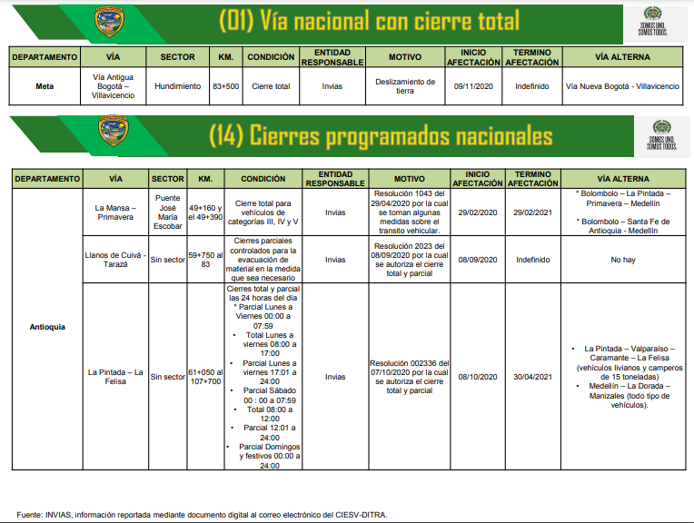 Boletín: Estado de vías