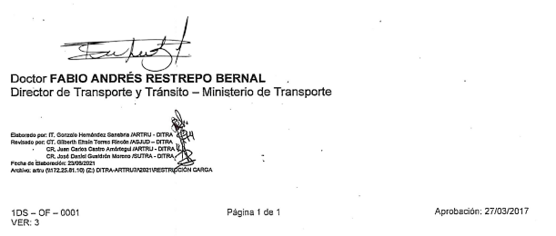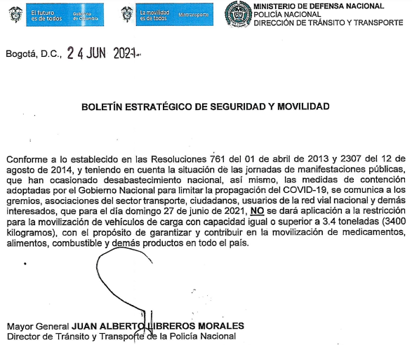 Conforme a lo establecido en las Resoluciones 761 del 01 de abril de 2013 y 2307 del 12 de agosto de 2014, y teniendo en cuenta la situación de las jornadas de manifestaciones públicas, que han ocasionado desabastecimiento nacional, así mismo, las medidas de contención adoptadas por el Gobierno Nacional para limitar la propagación del COVID-19, se comunica a los gremios, asociaciones del sector transporte, ciudadanos, usuarios de la red vial nacional y demás interesados, que para el día domingo 27 de junio de 2021, NO se dará aplicación a la restricción para la movilización de vehículos de carga con capacidad igual o superior a 3.4 toneladas (3400 kilogramos), con el propósito de garantizar y contribuir en la movilización de medicamentos, alimentos, combustible y demás productos en todo el país.