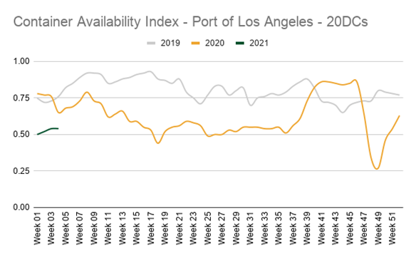 At the Port of Los Angeles, this saw Container xChange’s Container Availability Index (CAx) average 0.64 across 2020 – an index of 0.5 on CAx indicates a surplus of containers while below 0.5 indicates a shortage.