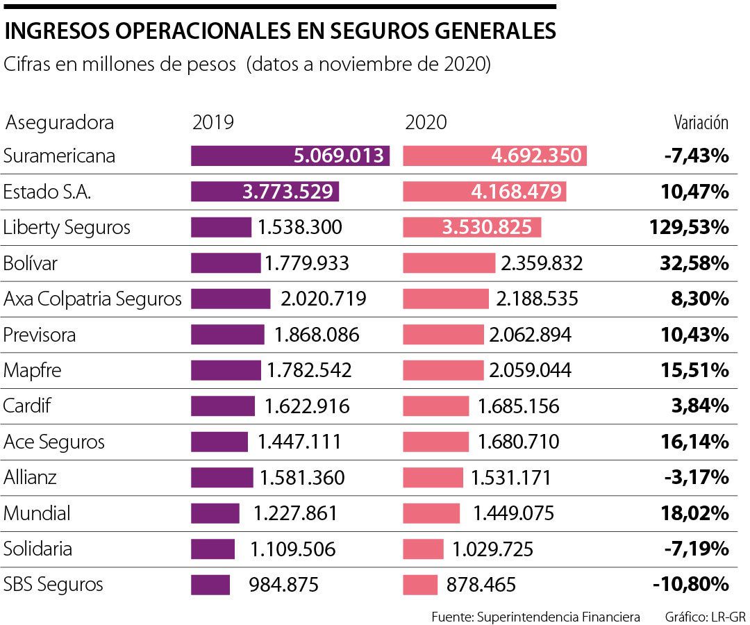 Suramericana, seguros del Estado, Liberty, bolívar y axa colpatria lideran este rubro, que facturó más de $32 billones a noviembre del año pasado A pesar de la...