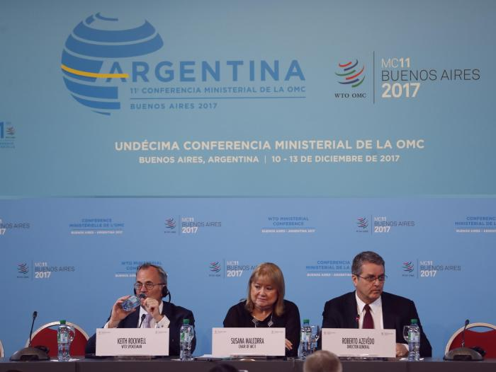 os Gobiernos de Argentina, Brasil, Colombia, Chile, Guyana, México, Paraguay, Perú, Surinam y Uruguay suscribieron la denominada “Declaración presidencial de Buenos Aires”, con la que ratifican la “importancia de preservar y defender el sistema multilateral del comercio”. La declaración se firma “a fin de promover el comercio basado en reglas, abierto, transparente, inclusivo, no discriminatorio y equitativo, encaramado en la Organización Mundial del Comercio (OMC), dotándolo de las herramientas que le permitan afrontar los desafíos del siglo XXI”, leyó el canciller argentino durante la inauguración oficial de la XI Conferencia Ministerial de la OMC. El acto contó, entre otros, la presencia de los presidentes de Brasil, Michel Temer; Paraguay, Horacio Cartes; y Uruguay, Tabaré Vázquez y se difundió un mensaje de la presidenta de Chile, Michelle Bachelet. Durante la instalación de la Conferencia, el director de la Organización Mundial del Comercio OMC, Roberto Azevedo, aseguró que “la amenaza del proteccionismo está omnipresente” y apostó por “preservar y defender” el sistema multilateral de comercio. “Debemos aprovechar esta oportunidad de la conferencia para progresar y fijar el rumbo para nuestra labor futura. Teniendo en cuenta el contexto económico actual”, añadió Azevedo en la apertura oficial del evento, que tendrá lugar en Buenos Aires hasta el próximo miércoles con autoridades del sector de los 164 países miembros de la organización.