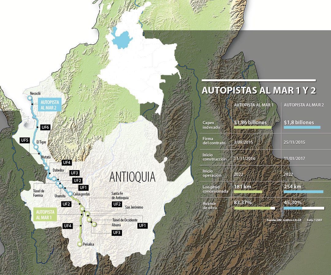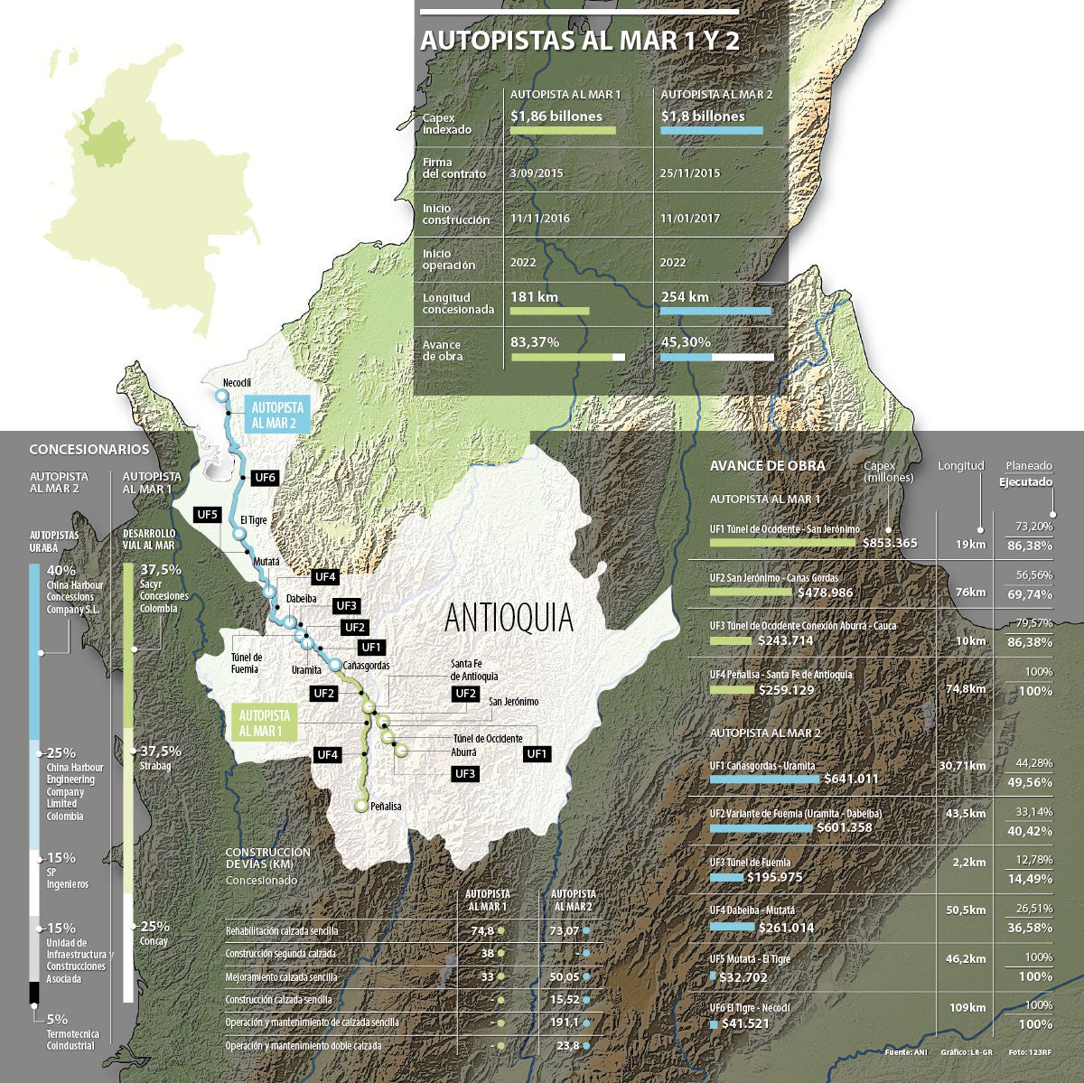Dos obras de infraestructura que avanzan a buen ritmo permitirán una alternativa para salir más rápidamente desde Medellín y el Eje Cafetero al Mar Caribe y Urabá. Se trata de las Autopistas al Mar 1 y 2, que hacen parte del programa de concesiones viales 4G y están previstas para entrar en operación el próximo año.