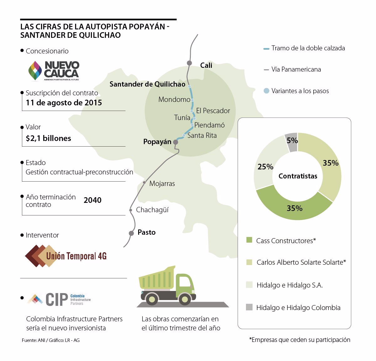 “La Agencia Nacional de Infraestructura (ANI) y el concesionario Nuevo Cauca están en la fase final de la cesión del contrato, lo que permitiría que antes de finalizar el año se dé ese negocio. Este es un proyecto de doble calzada, que ya es considerado un proyecto de país, es muy estratégico para la región y estamos seguros que se logrará la cesión”, explicó Ana Fernanda Muñoz, presidente de la Cámara de Comercio del Cauca.