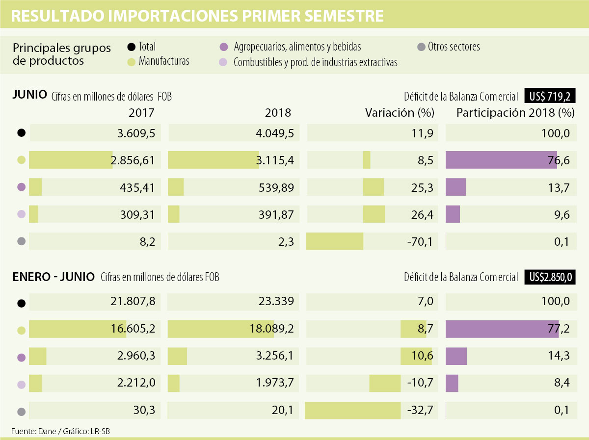 Déficit comercial. El primer semestre del año estuvo marcado por el desempeño positivo de las exportaciones, las cuales crecieron 14,7% con relación a los primeros seis meses de 2017, alcanzando US$20.489,1 millones FOB, mientras que por las importaciones el crecimiento fue más moderado, con un aumento de 7%, logrando un saldo de US$23.339,1 millones FOB.