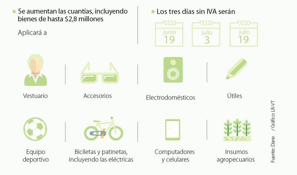 Según la reglamentación que quedó aprobada en la Ley de Crecimiento Económico, la medida cubría las siguientes categorías: vestuario, accesorios, útiles, electrodomésticos y equipos deportivos. Sin embargo, Romero agregó que adicionalmente, quedarán también cubiertos por la exención del impuesto las patinetas y bicicletas, tanto mecánicas como eléctricas, computadores, celulares y equipos de comunicación e insumos agropecuarios.
