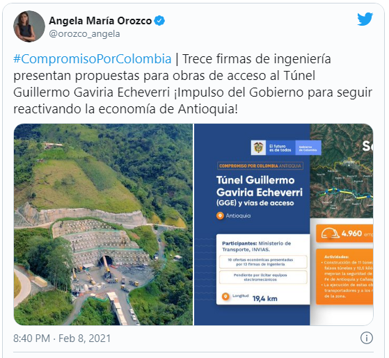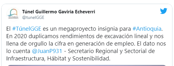 Juan Pablo López, secretario de Infraestructura de Antioquia, indicó que el año pasado la obra tuvo rendimientos de excavación superiores a los de 2019.