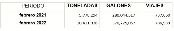 De la misma forma, en febrero 2022 se movilizaron en el país 370,725,057 de galones un 32.3 % más que en el año anterior y se realizaron un total de 786,939 viajes, 6.6% más que los realizados en 2021.