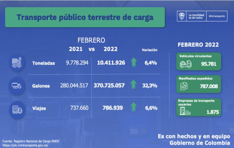 - El Registro Nacional de Carga del Ministerio de Transporte reportó más de 10 millones de toneladas en el mes de febrero, un 6.4 % más que el mismo mes del año 2021.