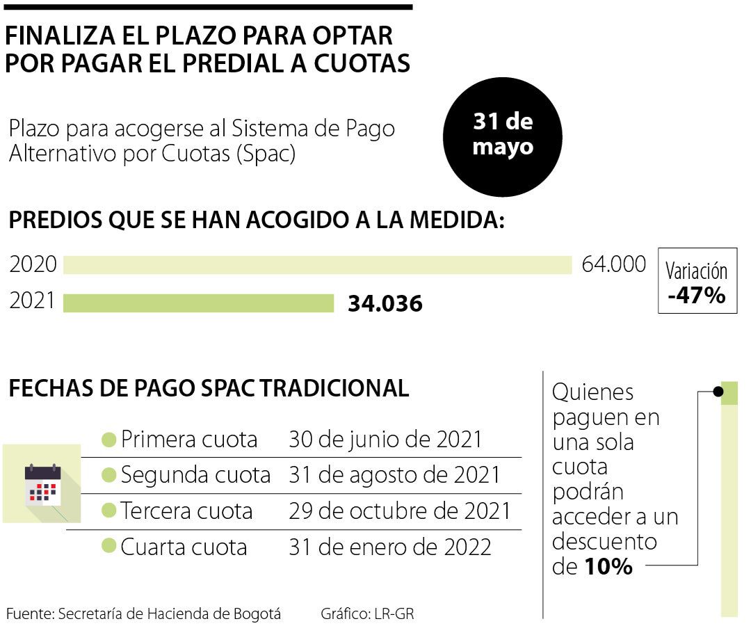 Hasta el 31 de mayo los ciudadanos de la capital se podrán acoger al Sistema de Pago Alternativo por Cuotas (Spac), a través del cual los propietarios de predios en Bogotá acceden a hacer el pago del predial en cuatro partidas a partir de junio.