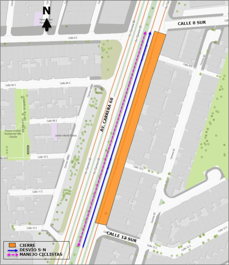 - Sentido sur-norte: Los usuarios que transitan en este sentido por la av. carrera 68 entre la calle 8 sur y calle 12 sur, podrán utilizar los dos carriles que permanecerán habilitados en este tramo vial.