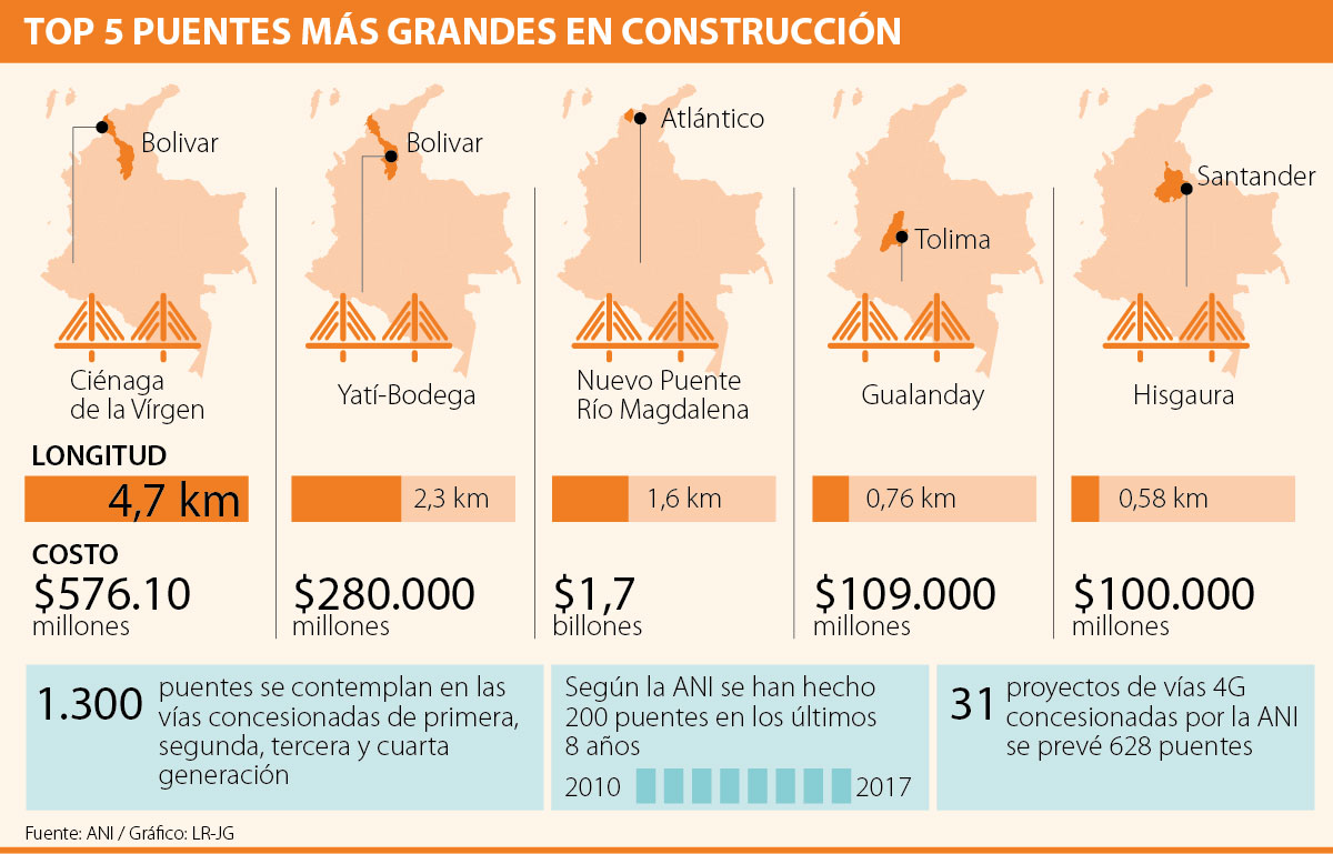 De esos, según información proporcionada por la misma institución, los más imponentes que están en construcción son el viaducto de Ciénaga de la Virgen, que será de 4,3 km y está programado para terminar obras en junio de 2018; y el puente Yatí-Bodega, de 2,3 km, y cuya inversión fue de $280.000 millones, también con inauguración programada para junio del próximo año.