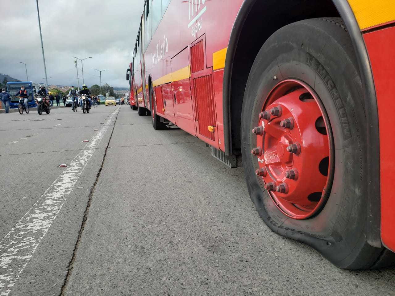 7:40 a.m. | Varios buses fueron pinchados para evitar que se movilicen por Bogotá. Las imágenes son cortesía de El Tiempo.