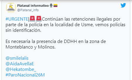 2:23 p.m. | El Representante a la Cámara por Bogotá, Inti Asprilla, insta a Claudia López a revisar la situación que se registra a esta hora en Usme, donde se denuncia agresión del ESMAD contra manifestantes.