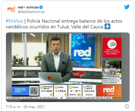 “Expresamos mucha preocupación por Tuluá. En hechos por esclarecer hay una muerte violenta, un número indeterminado de heridos y el Palacio de justicia incendiado. Estamos en contacto con autoridades y sociedad civil. Recordamos que DDHH y diálogo son la vía para superar esta situación”, manifestó el organismo a través de un trino.
