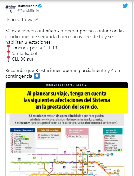 7:45 a.m. | Por manifestaciones en el sector, Transmilenio anuncia que se deja de prestar servicio de los alimentadores en la 1 de Mayo y 20 de julio: