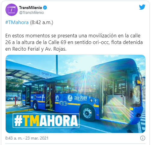 Desde hace unos minutos se presenta una manifestación contra Transmilenio al occidente de la capital colombiana. Este plantón está organizado por propietarios de buses del SITP provisional y están ubicados en la calle 26 con carrera 69, por lo que la calle está bloqueada en sentido oriente-occidente.
