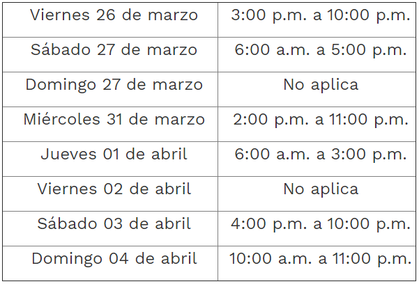 Teniendo en cuenta la dinámica vehicular que se registró en semana santa del año 2019, se aplicará la restricción a vehículos de carga con capacidad de 3.4 toneladas o más de la siguiente manera: