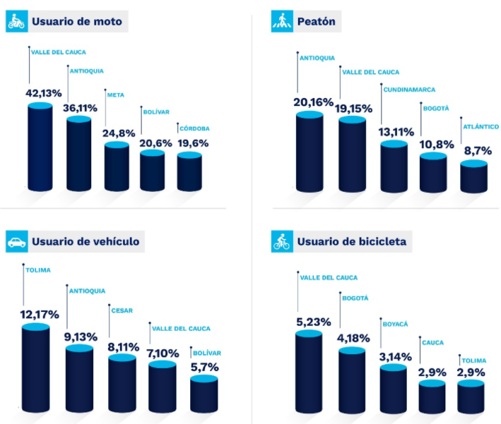 (16) y Tolima (14) quienes registraron incremento en víctimas fatales. “La seguridad vial es corresponsabilidad de todos, desde la ANSV reiteramos el llamado a las autoridades de los departamentos y municipios en donde se ha presentado aumento en la siniestralidad para que ejerzan mayor control y más esfuerzos de articulación para trabajar en estrategias en las que predomine el control en vía y la pedagogía, con el fin de impactar positivamente en la reducción de los siniestros y salvar vidas en las vías”.