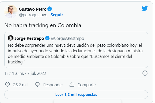 Este jueves Gustavo Petro escribió en sus redes sociales que “no habrá fracking en Colombia”, en un mensaje en el que le respondió un Tweet al economista Jorge Restrepo, quien señaló que la subida del dólar en Colombia se estaba presentando por la designación de la ministra de medio ambiente.