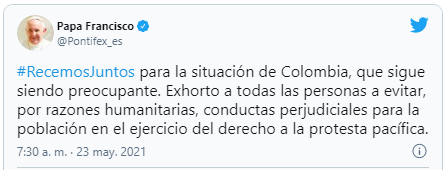 8:35 a.m. | Por segunda ocasión en 15 días, el Papa Francisco hace una llamando a Colombia por razones humanitarias y clama por el cese se acciones contra la población que protesta pacíficamente.
