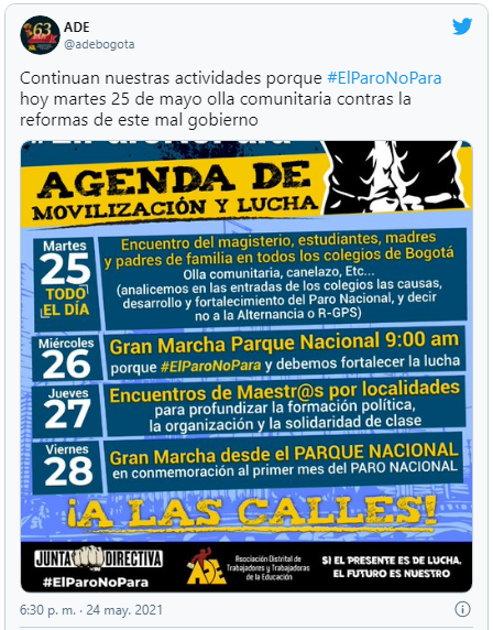7:10 a.m. | Cordial saludo. Este martes 25 de mayo se cumple el día 27 de protestas en Colombia contra el Gobierno Nacional y el funcionamiento del Estado. Hay una luz en los diálogos entre el gabinete del presidente Iván Duque y los promotores del paro a la espera de instalar una mesa de negociación.
