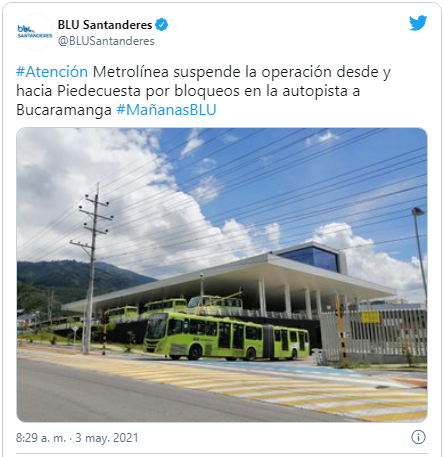 Por las manifestaciones que se registran a esta hora en la vía que de Piedecuesta conduce a Bucaramanga y que mantiene bloqueada la autopista, el Sistema de Transporte Masivo suspendió la operación desde y hacia ese municipio del área metropolitana. Transportadores avanzan en un plan tortuga hacia Bucaramanga.