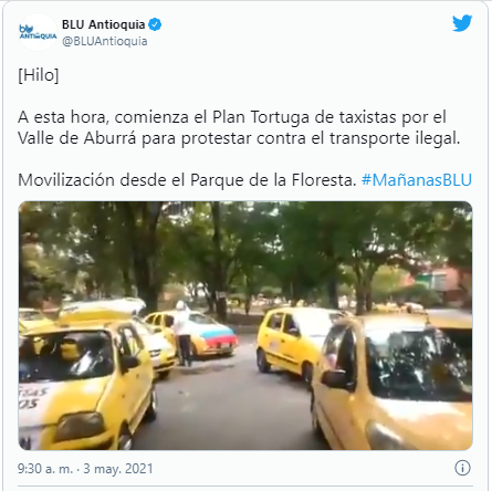A esta hora, diferentes asociaciones de taxistas y camioneros del Valle de Aburrá se concentran para comenzar una movilización de plan tortuga por la Avenida Regional hasta el sur del área metropolitana. Las concentraciones se realizan en Niquía, el el parque de la Floresta y Boston desde comenzarán estas protestas.