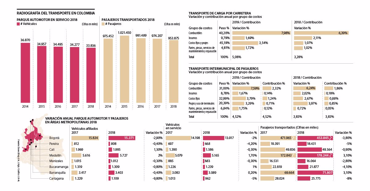 Según las cifras del Dane, en 2018 se transportaron 953,8 millones de personas en Colombia una cifra que cayó 2,08% frente a los 974,7 millones registrados en 2017. El parque automotor en servicio también presentó una caída al pasar de 34.227 unidades a 33.836 en 2018.