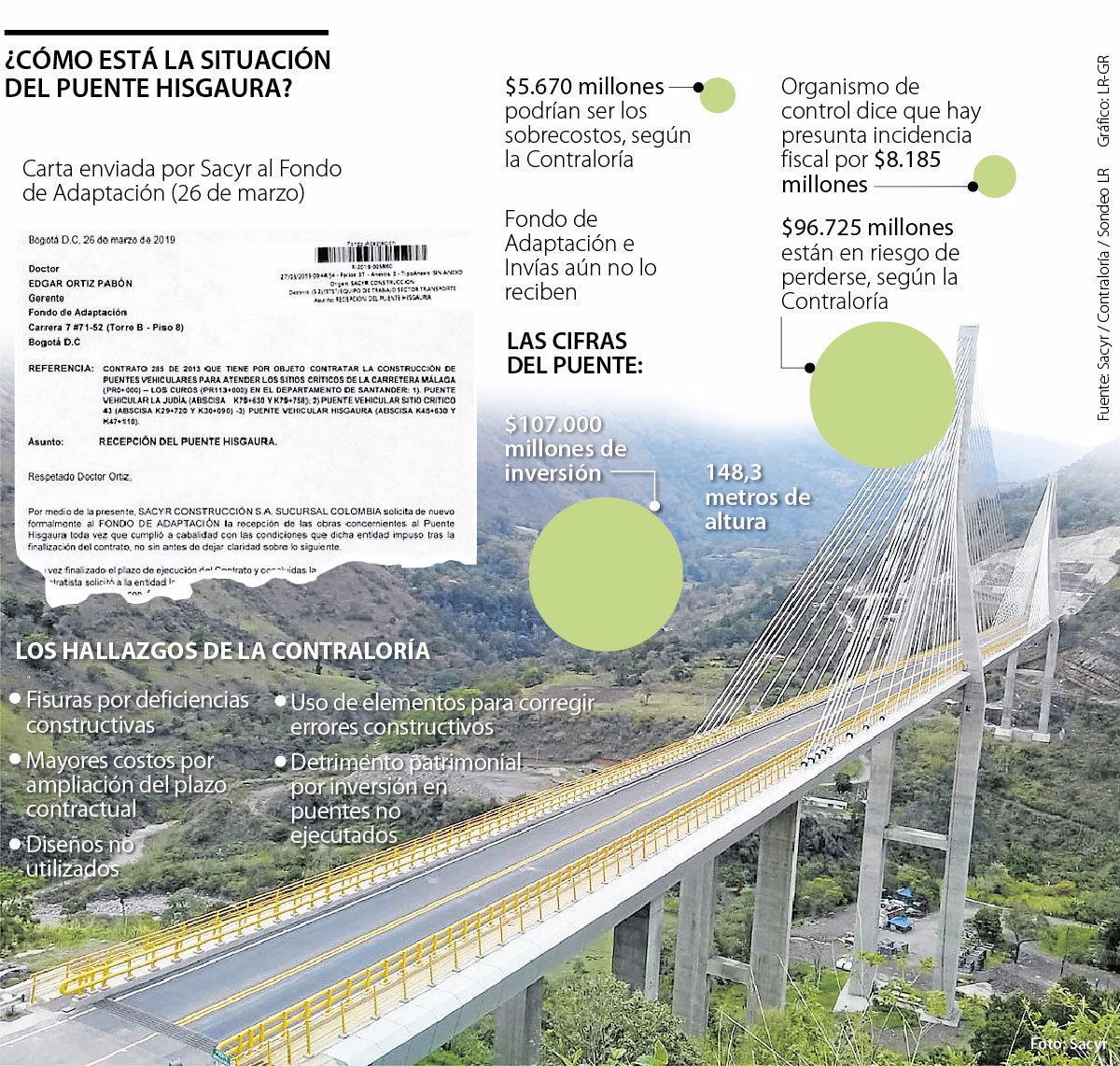 Puente Hisgaura. A los líos por los que atraviesa el puente Hisgaura, ubicado en la carretera entre Los Curos y Málaga, en el departamento de Santander, se le sumó una arista más. Se trata de una investigación que reveló ayer la Contraloría General de la República y en la que se encontraron sobrecostos por $5.670 millones, un presunto detrimento patrimonial por inversión en puentes no ejecutados y algunas fisuras por deficiencias en la construcción.