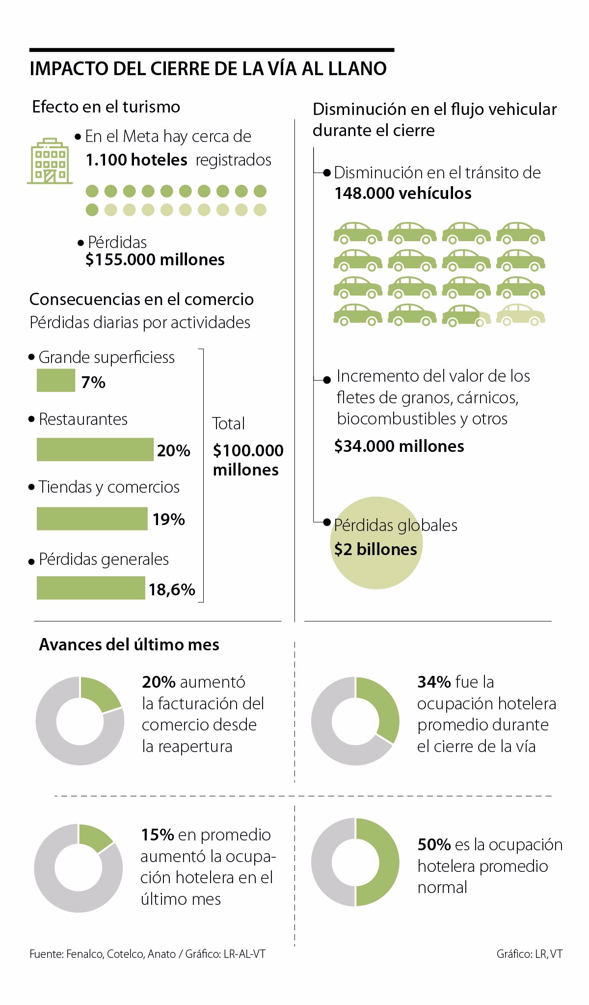 Según Fenalco, el meta registró una recuperación lenta tras la habilitación parcial de la carretera. Incluso, la ocupación hotelera mejoró Reapertura de la vía Bogotá – Villavicencio. Pasados 34 días desde que se reabrió parcialmente la vía que conecta Bogotá con Villavicencio, el departamento del Meta registra signos de recuperación económica de acuerdo con Fenalco. Por un lado, según cálculos de la agremiación, la facturación de los restaurantes aumentó 25%, respecto al lapso comprendido entre mayo y septiembre pasados, tiempo durante el cual la carretera estuvo cerrada. Además, la hotelería, que fue uno de los sectores más gravemente afectados por las limitada conectividad, también mejoró sus índices de ocupación. En concreto, se estima que el alza promedio durante las tres últimas semanas fue de 15%, sobre la base de 34% de habitaciones reservadas que se mantuvo durante la época del cierre, según Cotelco.