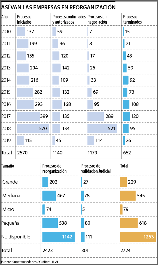 Durante el primer semestre de 2019 se aceptaron menos reorganizaciones que en el mismo periodo de 2018. Y este año 14 de cada 100 empresas en el proceso son de manufacturas Reorganizaciones empresariales. Durante el primer semestre del año, la Superintendencia de Sociedades admitió 115 empresas en reorganización, para llegar a un total de 2.423 empresas que están actualmente bajo el mecanismo que busca resolver sus problemas financieros y volver a hacerlas sostenibles. De este grupo, 346 están clasificadas en el segmento de comercio, mientras que el sector de manufacturas sumó 236 y el de servicios otras 215. Estos tres sectores son los que más empresas en reorganización han venido acumulando durante los últimos años, sin embargo, esto se da en parte porque también son los sectores que más negocios nuevos reportan. La razón, de acuerdo con el experto en economía empresarial, Raúl Ávila, es porque tradicionalmente la estructura económica del país ha estado dominada precisamente por la industria y el comercio, mientras que el sector de servicios está aumentando su participación tal como ya es posible ver en los reportes de crecimiento del Producto Interno Bruto (PIB) del Dane. Solo en el primer trimestre del año, el área de servicios creció 3% comparado con el mismo periodo del año anterior y 5,7% al compararlo con el último cuarto de 2018. Ahora, además de estos tres sectores, que han aumentado con velocidad el número de empresas en reorganización durante los últimos dos años, se debe analizar también el sector de transporte, que según el reporte de la Superintendencia de Sociedades es el que más ha aumentado sus empresas bajo esta figura, al pasar de 26 a 43, con un alza de 65% desde 2017. Aunque el fenómeno en general podría atribuirse a las turbulencias que ha tenido la economía del país con la caída de los precios internacionales del petróleo, el ex superintendente Luis Guillermo Vélez explicó que, en las empresas, no todo son factores macroeconómicos. También es necesario evaluar cada caso de estos negocios, pues su entrada al proceso de reorganización también podría ser consecuencia de factores como baja productividad o competitividad, alto endeudamiento u otro problema financiero e incluso una mala administración. En el caso de transporte, uno de los agravantes, según Vélez se puede dar por consecuencia de reorganización de las empresas del Sitp, sin embargo, hay que ver factores de coyuntura, particulares del sector de transporte urbano; como la llegada de varias aplicaciones que desplazan a empresas que no se están actualizando en nuevas tecnologías. Otras razones que pueden afectar, de acuerdo con el director del PhD del Aden Business School, Luis Fernando Martín, están por ejemplo una disminución del consumo interno que se combinó con el incremento de la tasa de cambio, disminuyendo sus ventas a la vez que el costo de insumos subía. El segundo sector que más aumentó en dos años el número de empresas en reorganización es construcción, con 39% al pasar de 93 a 103. Según Ávila, esto se debe a un cambio en la dinámica del sector, tanto de obras civiles contratadas por gobiernos subnacionales y el Gobierno Central como de las viviendas, que impulsó la creación de más empresas en el sector para que, por ejemplo, ejecutaran obras mediante el modelo de leasing.