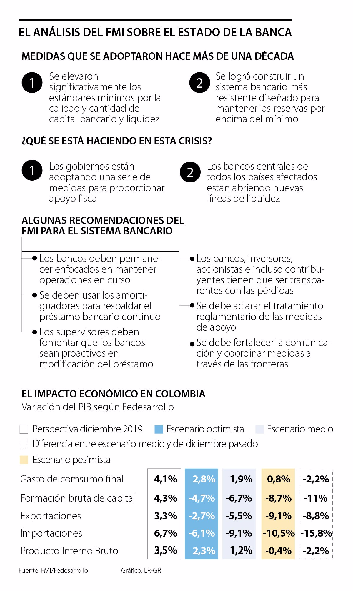 El panorama actual se compara con la crisis financiera de 2008, según Tobias Adrian y Aditya Narain del organismo internacional FMI. Impacto Económico. “La presión sobre el sistema bancario está aumentando y es inminente que haya más impagos de deuda. Y muchos esperan ahora un impacto en el sector financiero similar en magnitud a la crisis de 2008”, aseguraron Tobias Adrian y Aditya Narain, director y subdirector del Departamento de Mercados Monetarios y de Capital del Fondo Monetario Internacional (FMI). La serie de presiones que se están dando en el sector bancario producto de las medidas que han adoptado los gobiernos para contener la propagación del Covid-19, se traducirían en que los sistemas bancarios de algunos países tendrían que ser recapitalizados o, incluso, reestructurados si sus economías sufren mucho por la prolongada disrupción generada por la pandemia, dijeron los expertos del FMI. Debido a los retos que tiene la banca en algunas partes del mundo, producto del cierre del comercio, el aumento del desempleo, el cierre de fronteras y otros aspectos, Adrian y Narain compartieron siete recomendaciones para mantener la seguridad del sistema bancario en medio de la crisis que se está viviendo por el Covid-19. Actualmente los gobiernos están adoptando una serie de medidas para proporcionar apoyo fiscal y los bancos centrales de todos los países afectados están abriendo nuevas líneas de liquidez. Para que estos esfuerzos no se ven empañados es necesario que primero, los bancos permanezcan enfocados en mantener operaciones en curso y segundo, que usen los amortiguadores para respaldar el préstamo bancario continuo. Un tercer consejo es fomentar que los bancos sean proactivos en modificación del préstamo. Los bancos, inversionistas, accionistas e incluso contribuyentes tienen que ser transparentes con las pérdidas y esta es una cuarta recomendación. En quinto lugar está que se debe aclarar el tratamiento reglamentario de las medidas de apoyo adoptada por cada Gobierno. La sexta recomendación es fortalecer la comunicación entre los actores público y privados que se verán afectados por las medidas tomadas. Y, el séptimo consejo es coordinar las estrategias que se adopten a través de las fronteras, debido a que la banca es un sector global, dijeron los expertos del FMI. Sobre estas recomendaciones, Gregorio Gandini, analista y profesor en temas de Economía y Mercados, explicó que es lógico que se debe mantener una perfecta comunicación entre los diferentes actores del sector, para lograr coordinar los esfuerzos. “El aislamiento nos pone ante un escenario de una crisis mucho más fuerte que la de 2008, los bancos centrales han tomado medidas más rápidamente que van a mitigar el choque que tendrá la pandemia en la economía”, añadió Gandini. Las medidas que ha adoptado Banco de la República están orientadas a abrir canales de liquidez con el fin de que todos los actores del sistema puedan continuar con sus actividades y así no se dé un mayor choque, concluyó Gandini. Otros anuncios del FMI Además de esta serie de recomendaciones anunciadas por los expertos del FMI, el organismo internacional anunció que “aprobó un marco para una nueva ronda de préstamos bilaterales por el FMI del 1 de enero de 2021 para suceder a los actuales acuerdos bilaterales de préstamo (BBA) actualmente en vigor a través de finales de diciembre de 2020. Los nuevos BBAs tendrán una duración inicial de tres años hasta finales de 2023, la cual se puede extender hasta 2024”. Este anuncio tiene como fin asegurar que el FMI puede apoyar a sus miembros en las necesidades que ha afectado a más de 190 países, según Kristalina Gueorguieva. Miembros del G-20 ayudarán a los pobres Tras conocerse los anuncios que ha hecho el FMI en lo corrido de la semana para mitigar el impacto de la pandemia, Reuters informó que “el grupo de las 20 mayores economías del mundo anunció que presentará en dos semanas un plan de acción ante la pandemia del Covid-19 para abordar la vulnerabilidad en materia de deuda de los países más pobres y entregará ayuda financiera a las naciones de economías emergentes”. Las medidas serán adoptadas con base a una charla que sostuvieron los representantes con expertos del FMI y el Banco Mundial.} Fuente: La República Imagen: Archivo La República Ver artículo original Volver a página de inicio]]>