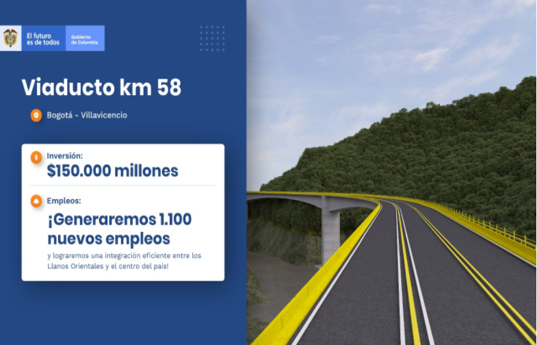 El proyecto de construcción del viaducto en el kilómetro 58, tiene una inversión de $150.000 millones, y con él se dará solución definitiva a la problemática que se registra en la zona por inestabilidad del talud y que en el pasado reciente mantuvo incomunicada a la capital de la república con el llano colombiano, afectando en forma considerable la economía de la región.