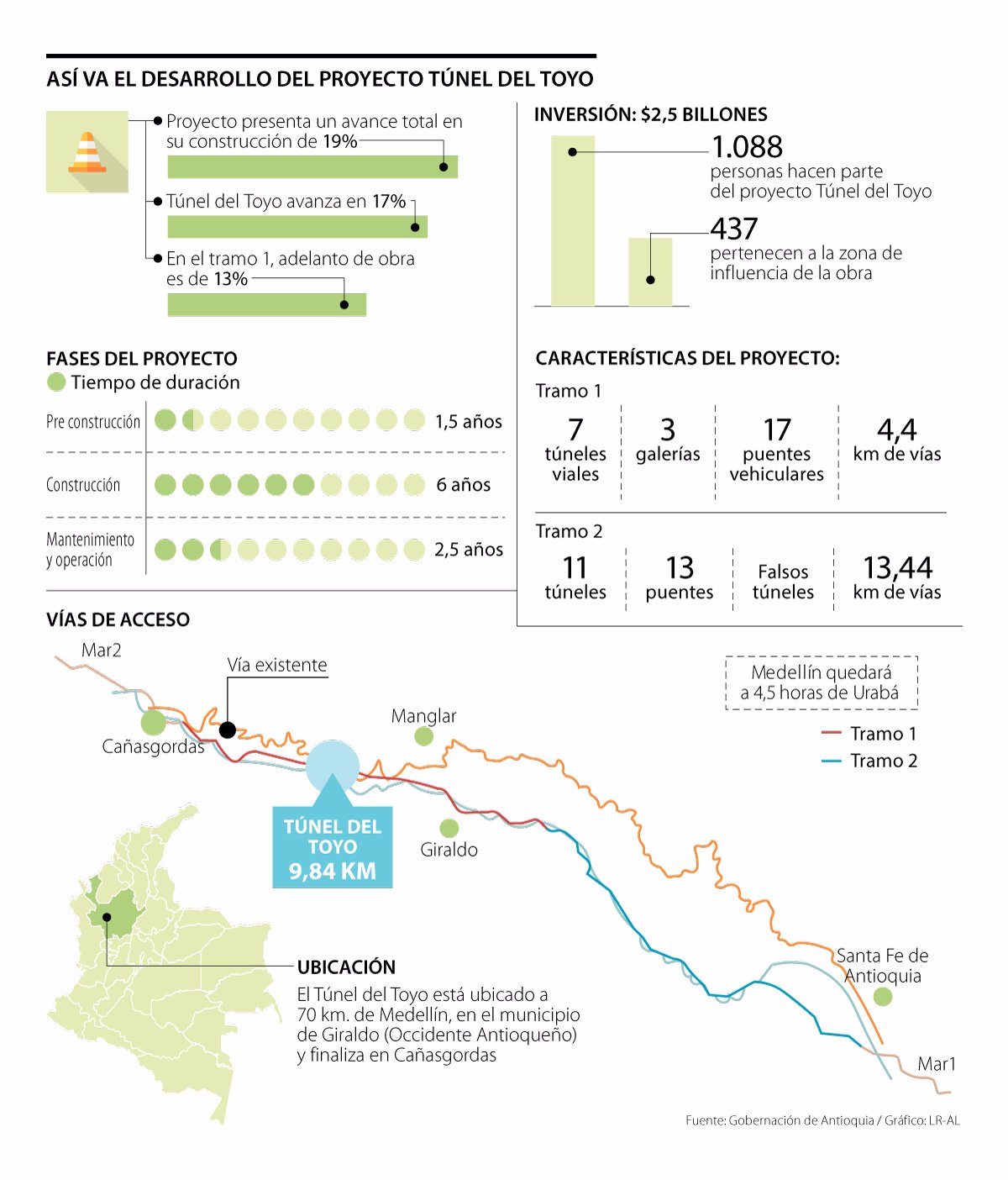 Túnel del Toyo. El desarrollo del proyecto del Túnel del Toyo avanza a buen ritmo. Un año después de iniciar su construcción, la Gobernación de Antioquia detalló ayer que el Túnel completa un avance de 17% mientras que las obras en general van en 19%. Aunque desde el despacho gubernamental aseguran que todo podría estar listo a finales de 2023, piden al Gobierno Nacional que agilice los trámites para la adjudicación del tramo 2, una de las dos partes que componen toda la infraestructura.