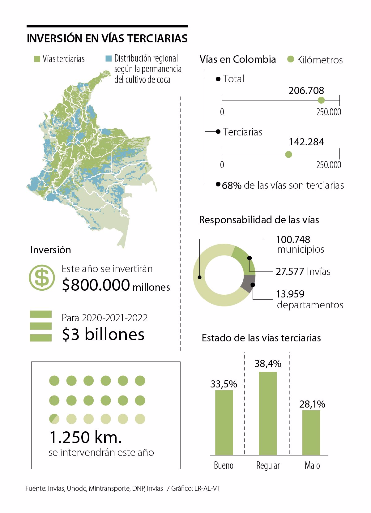 Vías terciarias. El programa que prevé cambiarle la cara a un poco más de 142.200 kilómetros de vías terciarias ya tiene un rumbo claro. Luego de que se postularon 900 municipios a la iniciativa ‘Colombia Rural’, y se firmaron 186 acuerdos en 2019, este año el Gobierno invertirá hasta $800.000 millones para la rehabilitación y mantenimiento de estos corredores. El monto no solo representará 60% más de lo que inicialmente se tenía planteado, sino que abrirá paso para que se inicie una reactivación en obras en este frente.