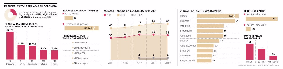 En cuanto a las zonas francas más importantes del país se destacan las ubicadas cerca a las costas Caribe y Pacífico, así como también las que están en Bogotá. Sin embargo, cabe resaltar que la medición se hace dependiendo de distintos factores. Por ejemplo, si es por el valor en dólares de las exportaciones desde estos espacios, que según el último informe del Dane, en julio de 2019 registraron un incremento de 25,2%, al pasar de US$225,8 millones FOB en julio 2018 a US$282,7 millones FOB en el mismo mes de 2019.